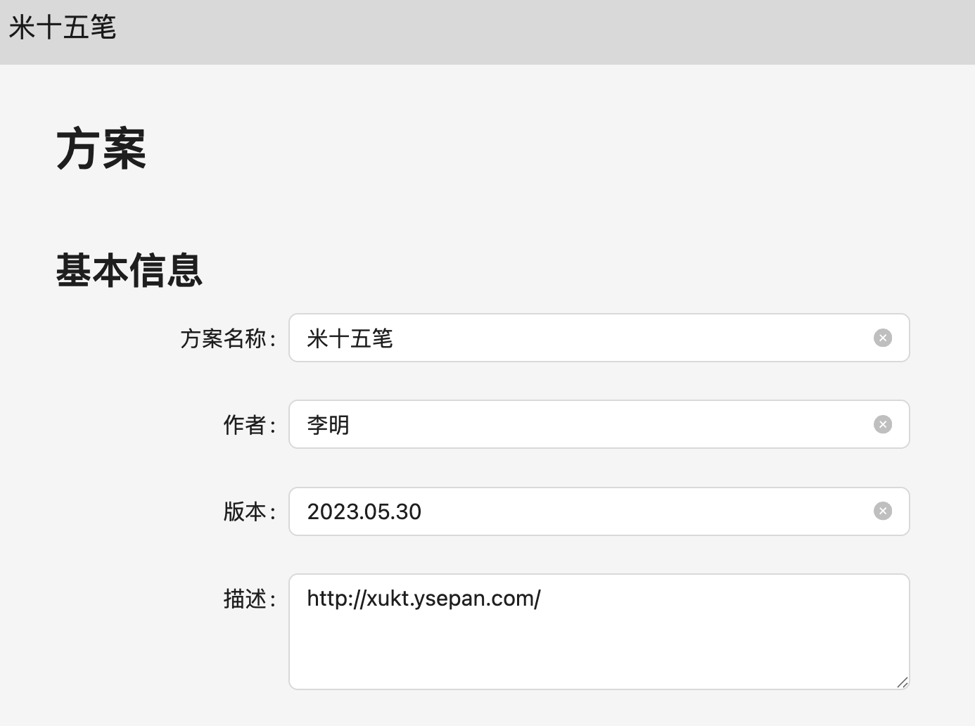 Section titled “基本信息的编辑”在首页可以编辑方案的基本信息,包括方案名称、作者、版本、描述等等。