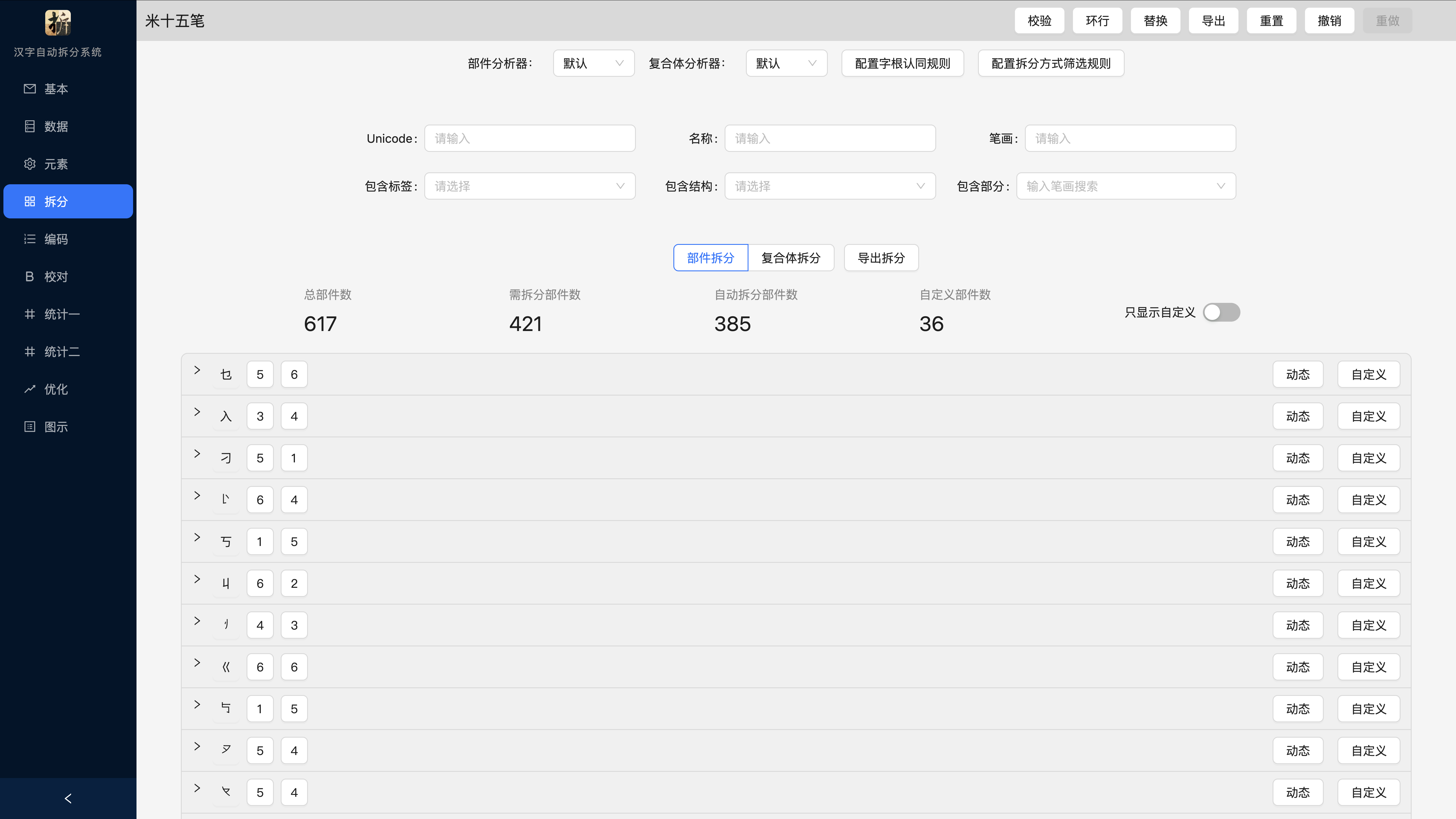 如果您在元素界面定义了一些字根和笔画,则系统将尝试将汉字拆分为这些字根和笔画的组合。这里首先说明一下系统拆分的逻辑。