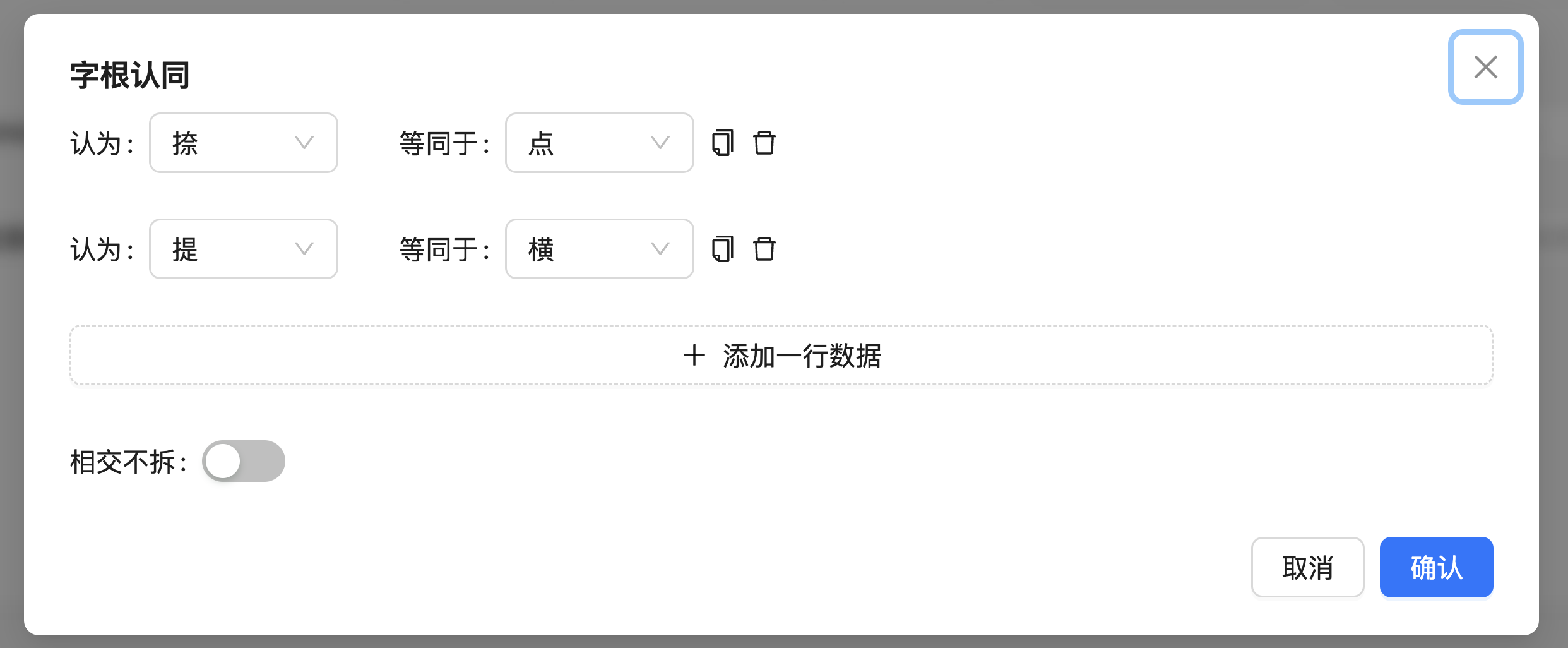 有些形码方案(如小鹤音形和二笔类)认为如果一个字根中的某些笔画与字根之外的其他笔画相交,就不再认为是这个字根。如果您的方案属于这一类,需要勾选「相交不拆」规则。