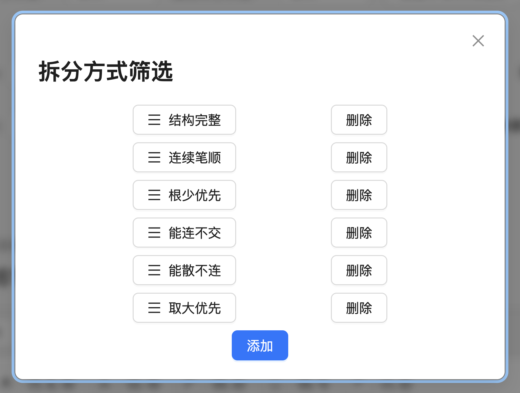 - 全符笔顺,筛选出拆分完全符合笔顺的方式。