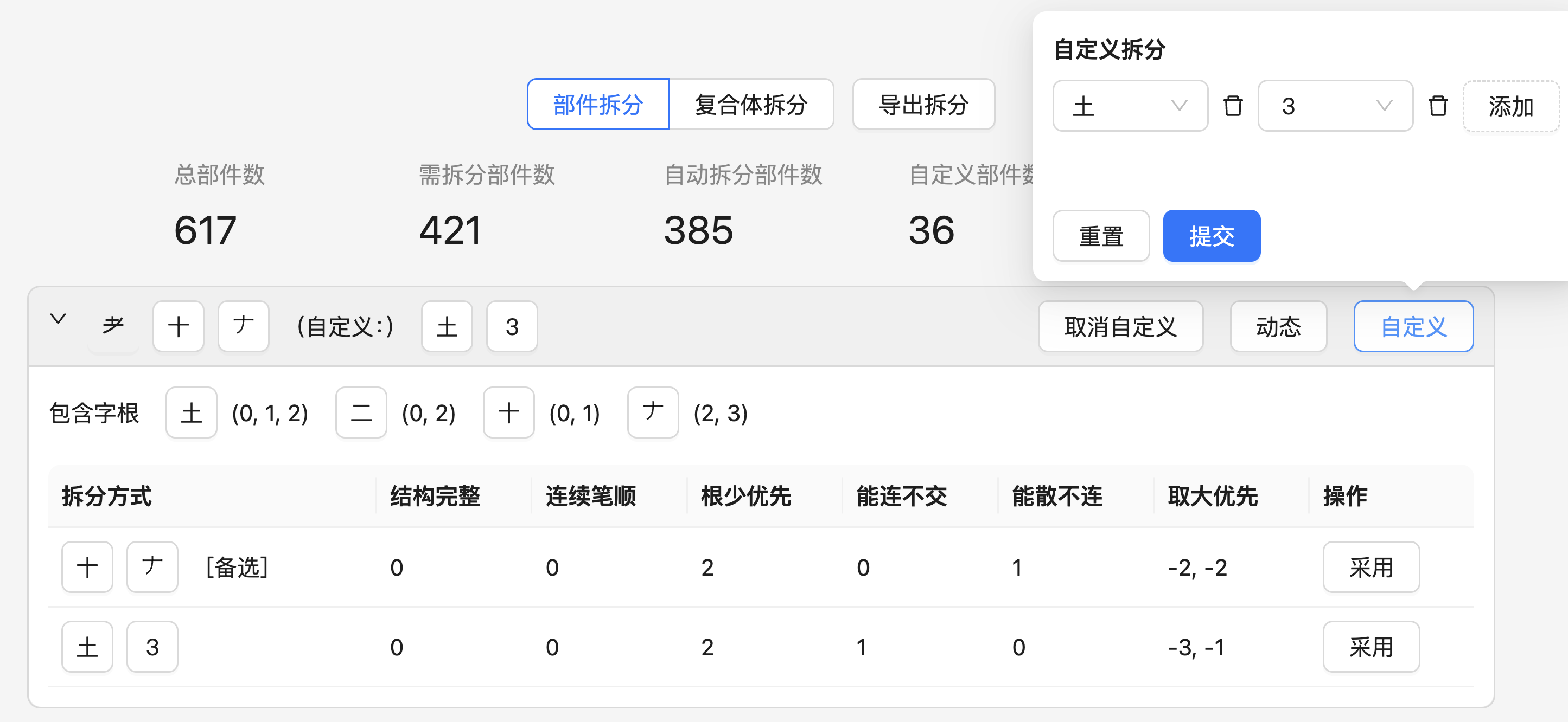 Section titled “配置自定义部件分析”因为汉字本身是千变万化的,部分的部件拆分结果无论怎么调整都有可能不合预期,或者就是单纯想添加无理拆分提高效率,这种情况下可以在相应拆分右侧添加自定义拆分。例如,「米十五笔」中将「耂」拆分为「土」、「丿」,但实际按规则应该拆为「十」、「𠂇」。