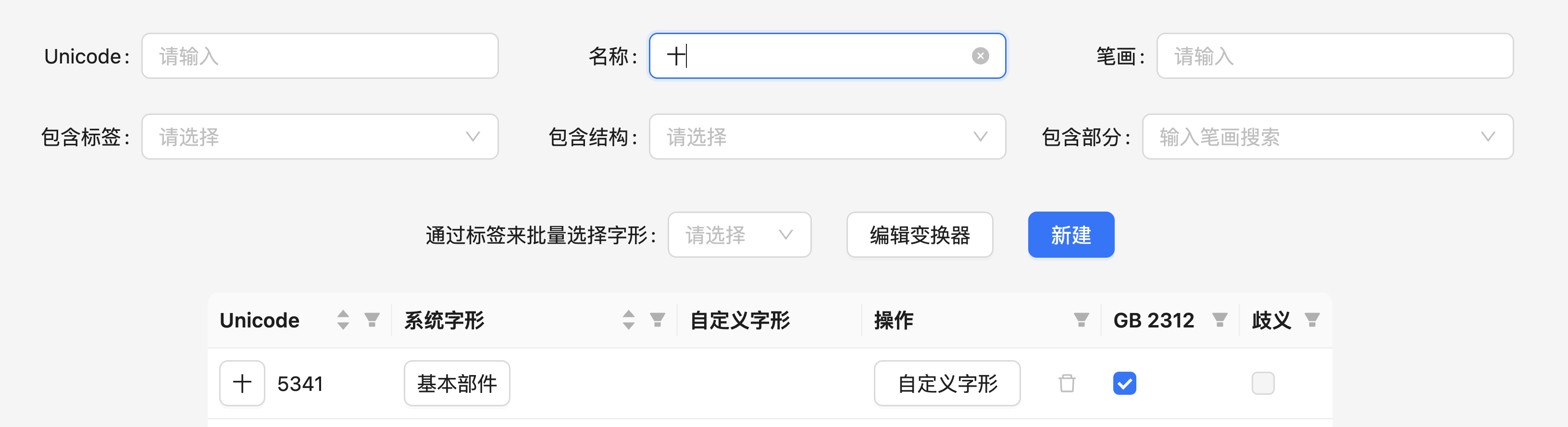 Section titled “为什么每个字有多个字形”此外,对于一个汉字,系统可能会提供它的一个或多个字形。一般来说,每个汉字只有一个字形,例如「十」就只有一个字形,它是一个「基本部件」: