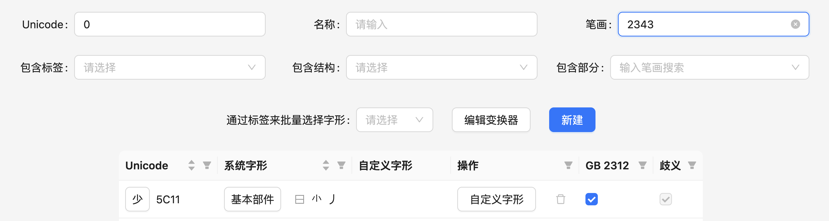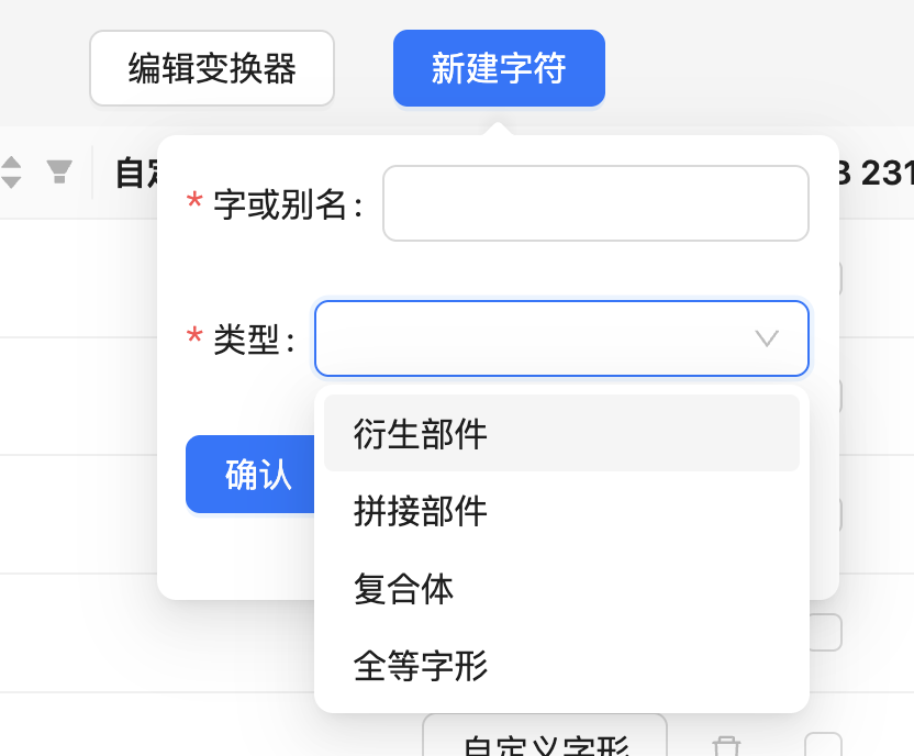 上图中,如果在「字或别名」中输入两个或以上的 Unicode 字符,则默认在私用区(U+F000 ~ U+F9FF)自动生成一个新的字符,其码位从 U+F000 开始依次递增;然后将输入的内容作为这个字符的别名。如果输入的是一个 Unicode 字符,则按其自身的码位加入。