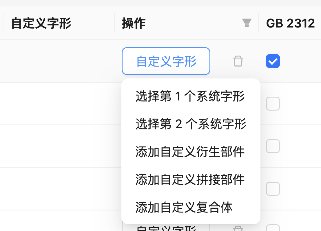 一个字究竟采取哪个字形,在不同的方案之间有一定的灵活空间。例如,一个采取分部取码的方案通常会自己定义哪些字可分、哪些字不可分。因此,方案可以在系统提供的多个内置字形中任意选择一个,也可以自己从头创建一个。自定义的菜单如图所示: