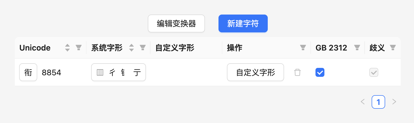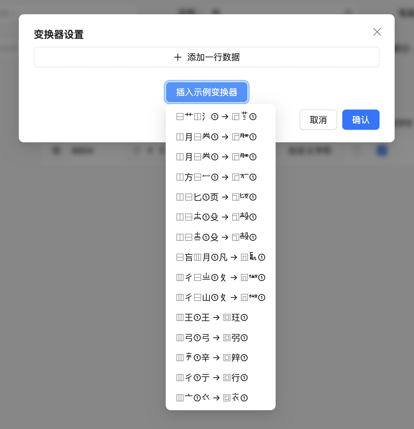 在预置的变换器列表中发现「⿲彳①亍 → ⿴行①」这个条目,点击添加之后,可以看到变换器列表中出现了这一项: