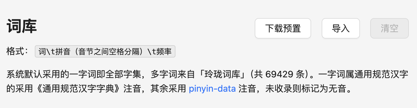Section titled “词库和字集过滤”在「基本」页面的右上方,您可以看到关于系统默认采用的词库的说明。您可以下载该词库,查看其格式并根据您的需要定制,再上传。