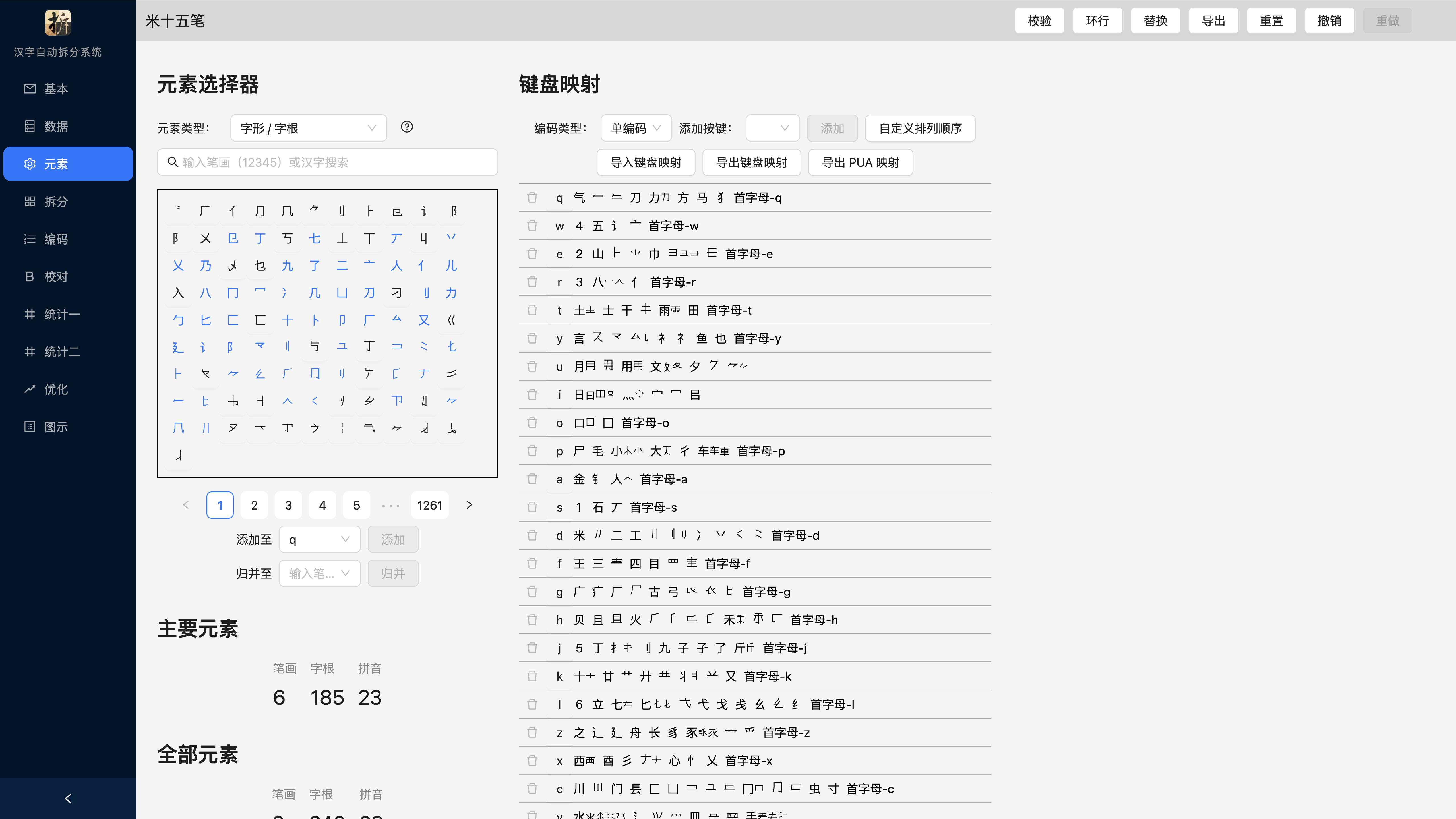 以米十五笔为例,从右边的「键盘映射」模块可以看出,它包含字根(显示为单个汉字)、笔画(显示为全角数字1、2、3、4、5、6)和汉语拼音的首字母(显示为 首字母-q 这样的名字)三类不同的元素。下面我们将分类讲解各种元素的作用。