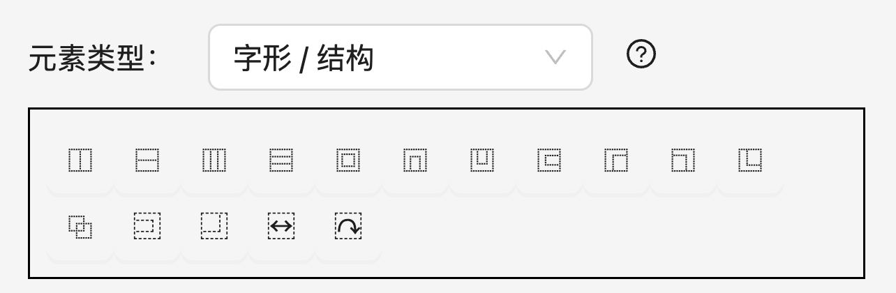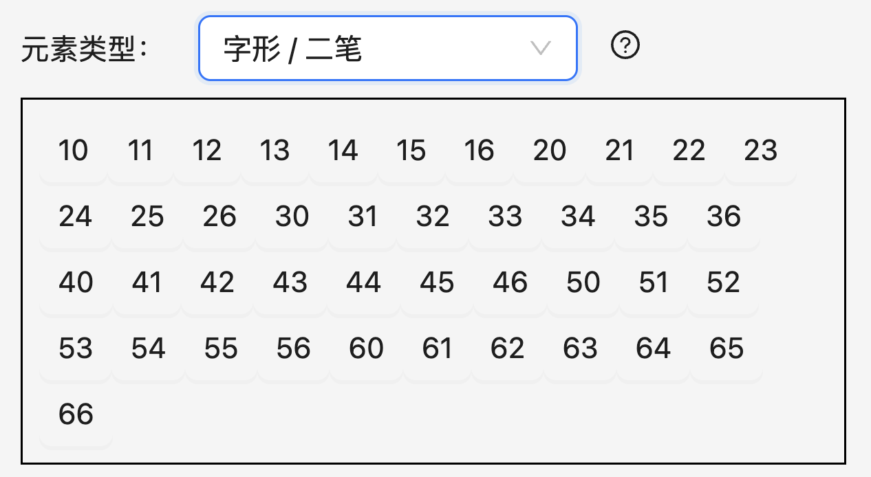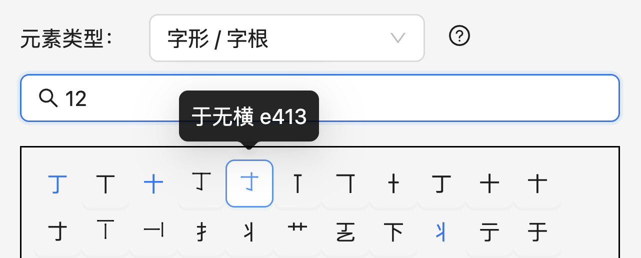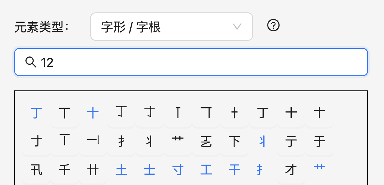 在本系统中,所有至少包含 2 个笔画的字符都可以作为字根(单笔画的处理请见下一节)。您可以在「元素类型」下方的搜索框中输入汉字或其笔画(用 12345 表示国标分类的横竖撇点折)来从现有的字形数据库中搜索一个字根。例如,搜索「12」可以看到如下结果: