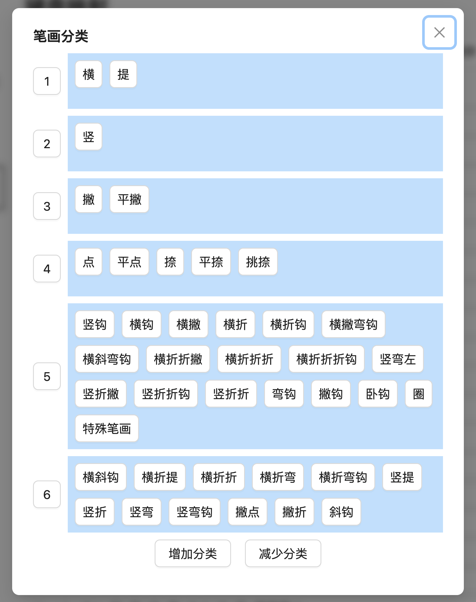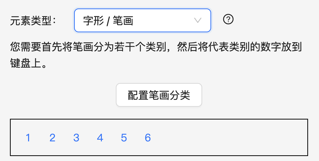 本系统共定义了 41 种笔画。一般来说,输入方案会将这些笔画分为若干类来处理,例如国家规范(GF2001-2001)给出的笔画分类规范将笔画分为五类(横竖撇点折)。本系统中将分类用数字表示(1、2、3、4、5、……),各个方案可以根据自己的需要创建任意数量的分类(例如「米十五笔」方案就使用了六个分类),每个分类所包含的笔画在「配置笔画分类」中定义: