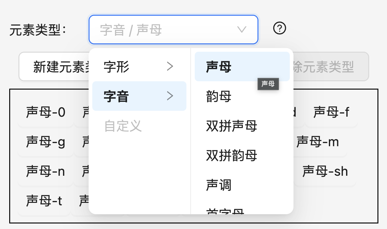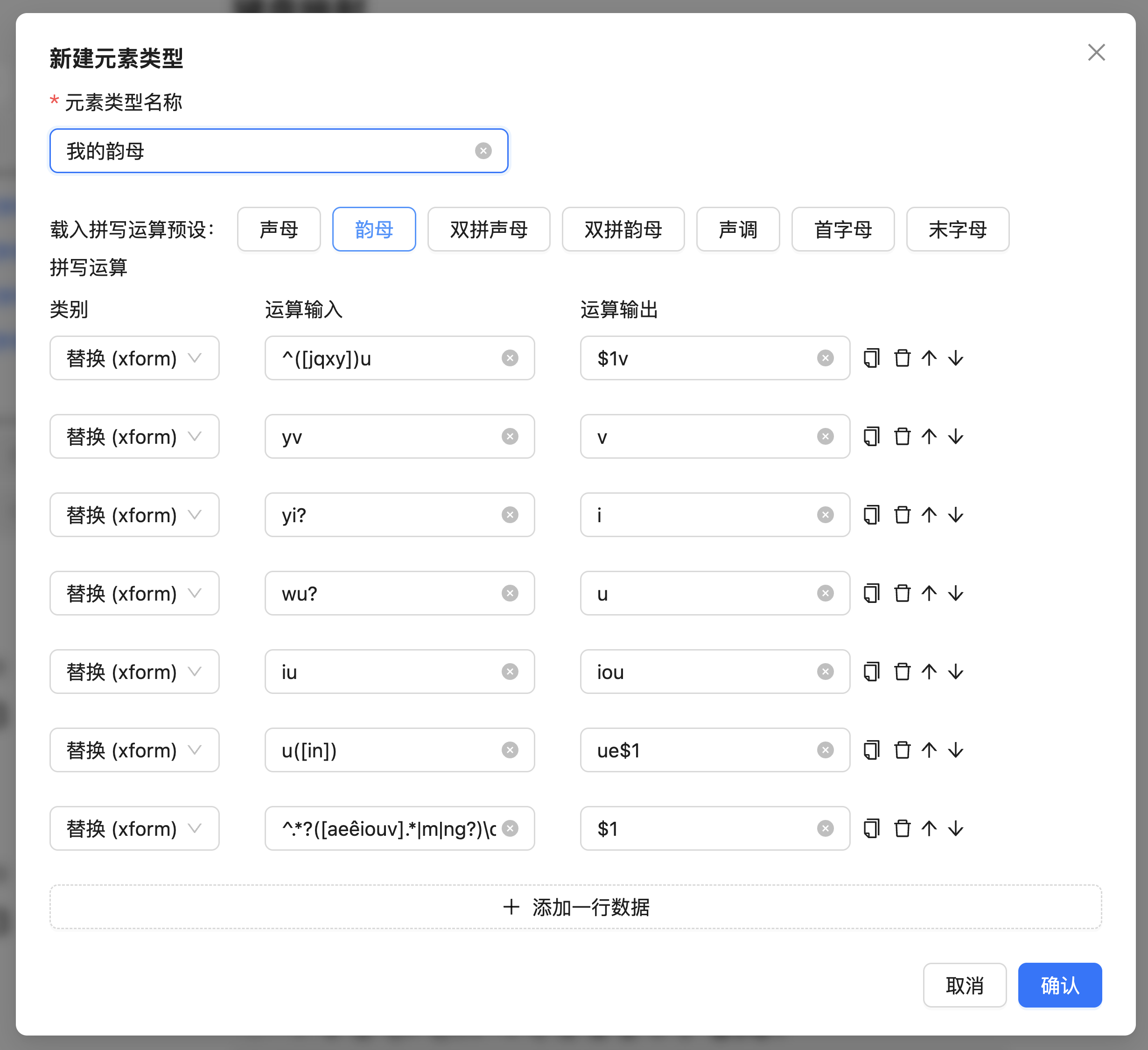 系统内置了声母、韵母、双拼声母、双拼韵母、声调、首字母和末字母这几类元素的拼写运算,这些拼写运算默认以带调全拼为输入,并给出相应的成分。您也可以新建自己的拼写运算来执行自己想要的分析。点击「新建元素类型」,您可以直接编写拼写运算的各条规则,或载入某个拼写运算之后在此基础上修改: