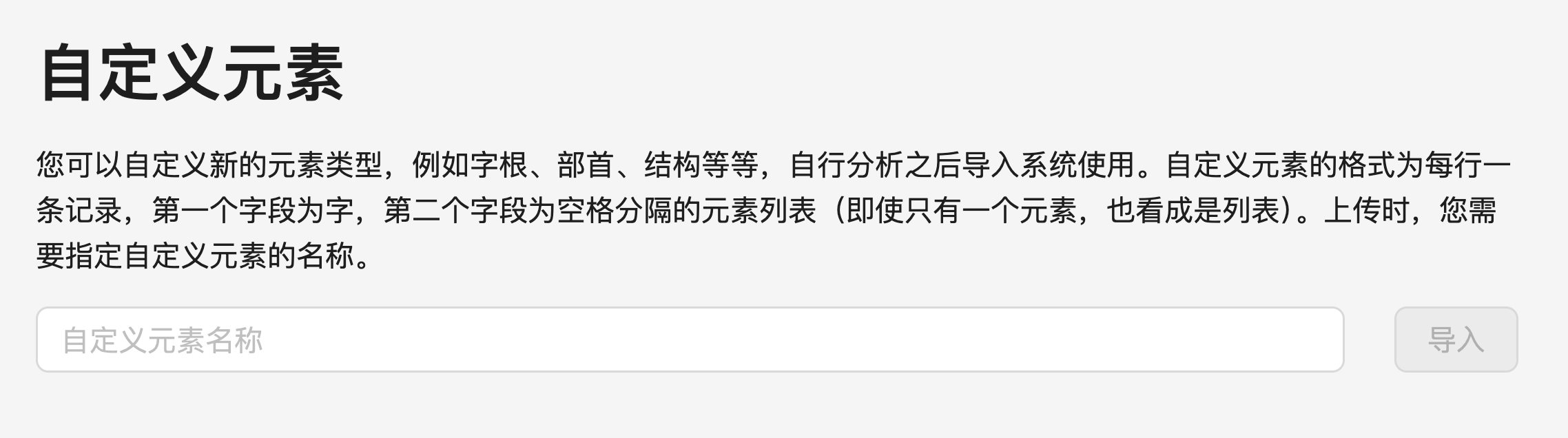 有时候,系统所默认的对于字形和字音的分析方式可能不满足您的需要,此时您可以在系统的外部生成自己的元素,然后导入系统使用。该功能位于「基本」页面的右下角,请参考相应说明导入。