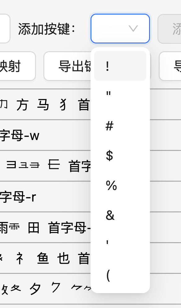 对于每一个元素,我们将指定它如何对应到编码,这种对应方式称为一个「安排」。首先,我们需要确定方案使用哪些字符作为编码字符(本系统支持使用全部 94 个可打印 ASCII 字符来编码),可以在「添加按键」中添加: