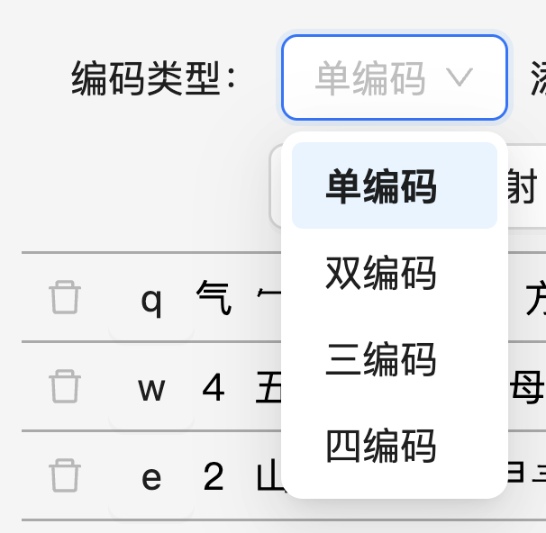 然后我们需要指定方案的编码类型,即每个元素最多用几个编码表示。大多数输入方案属于「单编码」,但像郑码等方案会出现一个元素用两个或以上的编码表示,此时就会用到「双编码」「三编码」甚至「四编码」。本系统最多支持四编码。