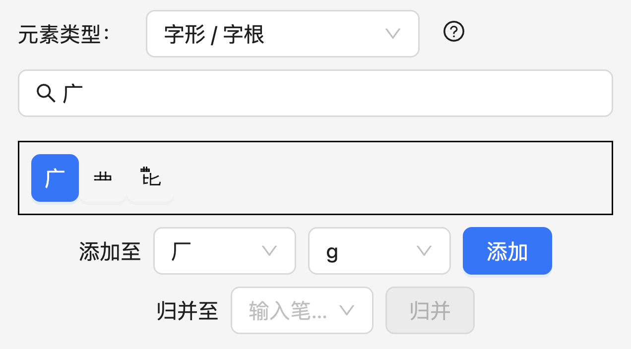Section titled “「键位」安排”「键位」安排是指逐个指定元素的各个编码。例如,对于单编码方案来说,「键位」安排就是一个编码;对于双编码方案来说,「键位」安排就是两个编码。在元素选择器中选择相应的元素后,在下方的「添加至……」输入相应的编码即可:
