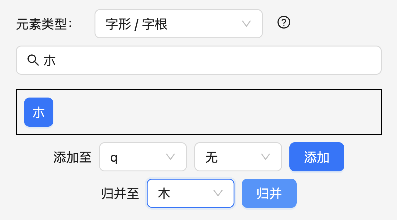 Section titled “「归并」安排”「归并」安排是指令某一个元素的所有编码等同于另一个元素。例如,在「米十五笔」中,「朩」归并到「木」: