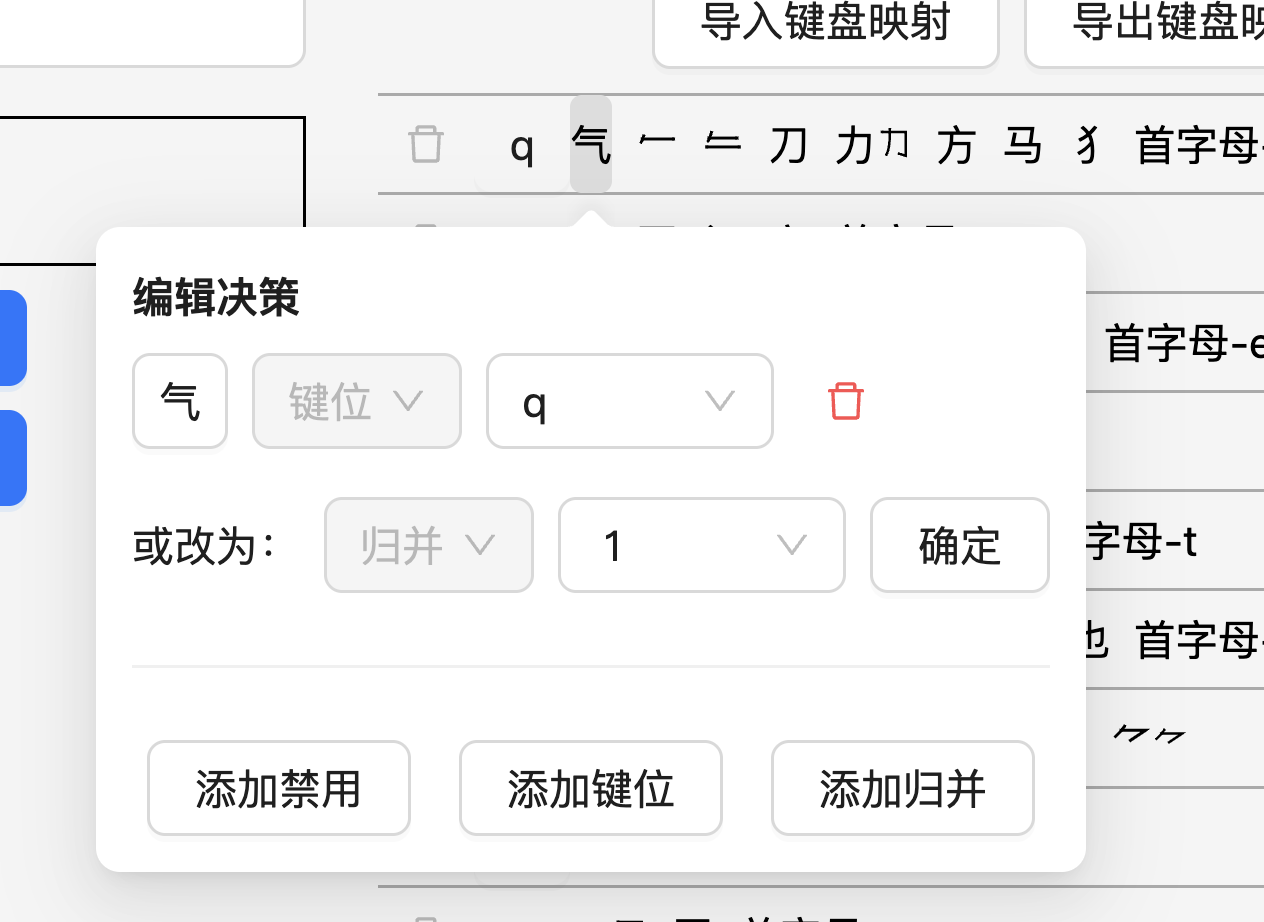 Section titled “在键盘上编辑安排”在元素首次添加安排之后,元素会出现在右侧的「键盘映射」模块中。将鼠标移动到元素上面,会出现一个气泡,可以在里面直接修改元素的安排。例如,在下图中您可以修改元素「气」的键位,或者将其从键位改为归并。